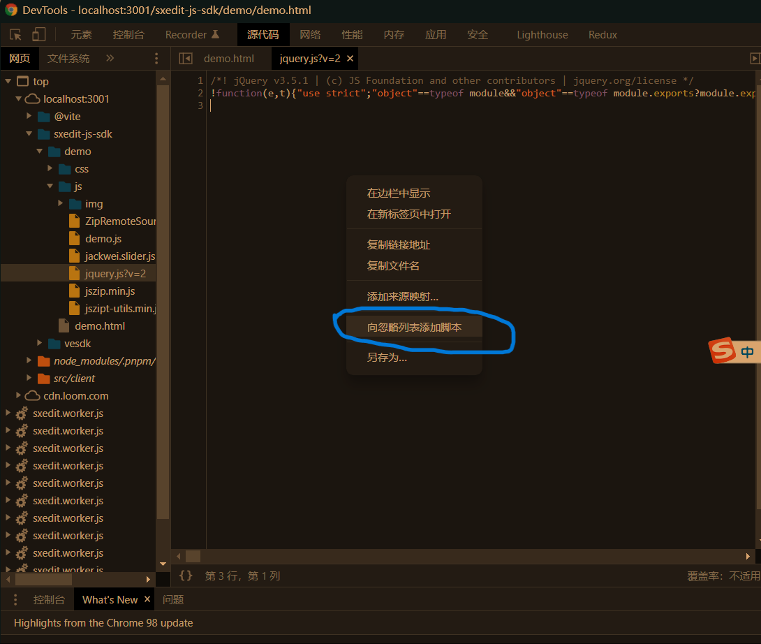 - 其中如果我们不想要在断点执行某个 js 文件,例如第三方库,我们可以把这个库放入“黑盒脚本”里: